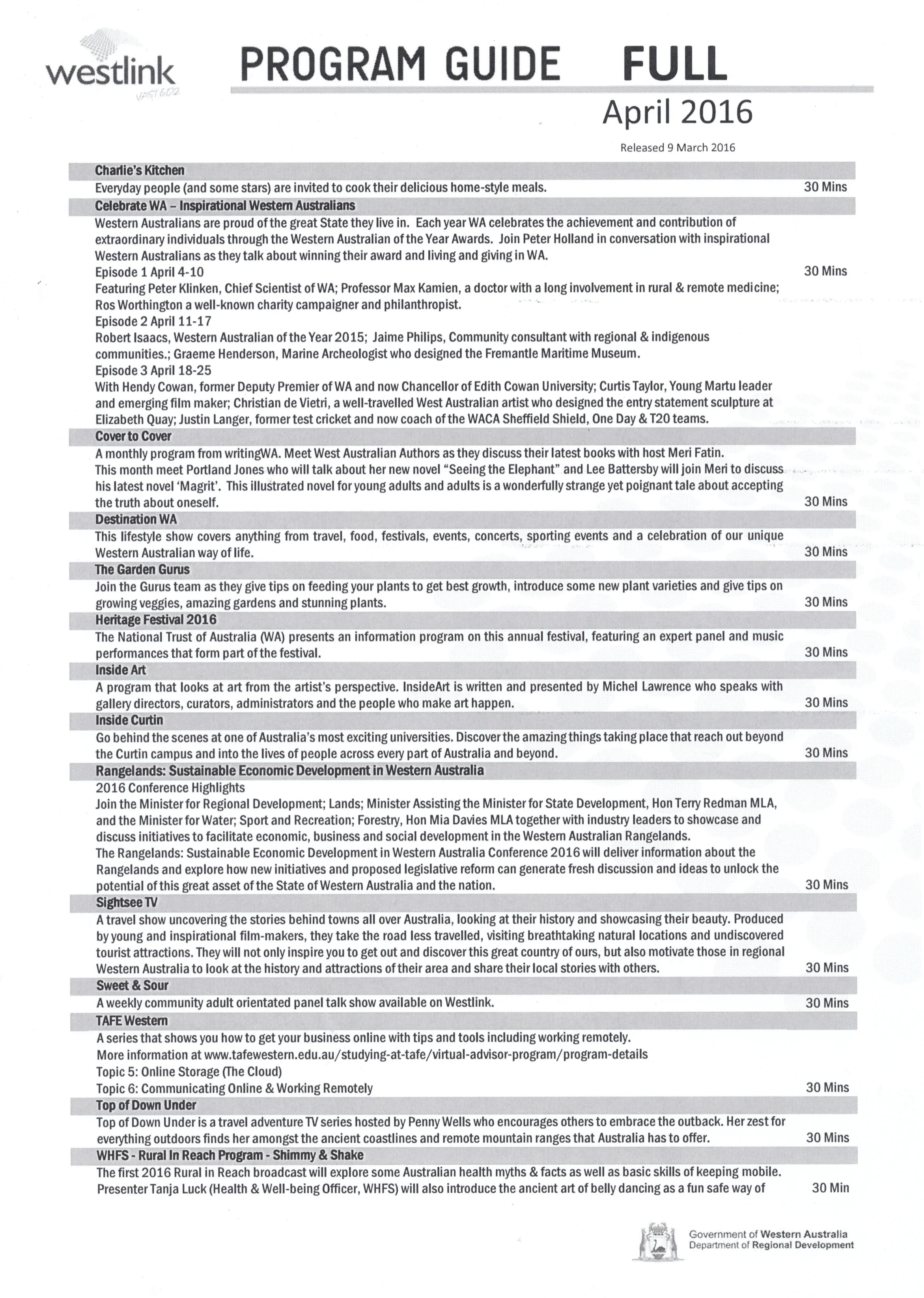 Hi all, the newest Westlink Program Guide if out for any anyone who is interested in coming down to the Meeka CRC and having a bit of a watch on our TV for ideas for yourself or would like to know about Heritage Festival, Inside Art or Wodworking Masterclass.